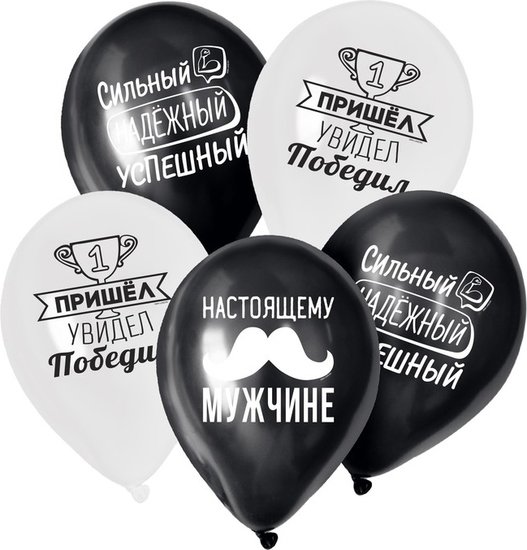 | Информация | В набор входят шары с надписями: - сильный надёжный успешный - пришёл увидел Победил - настоящему мужчине |
