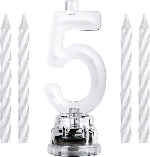 | Информация | Цифра-подсвечник представляет собой прозрачную цифру "5" на подставке высотой 7 см со встроенным светодиодом. Также в комплект входят аккумулятор и 4 парафиновые свечи высотой 6 см. Свеча устанавливается в держатель подсвечника и зажигается, подсвечник включается с помощью силиконового переключателя на дне подставки. Плавная смена цвета происходит автоматически. |