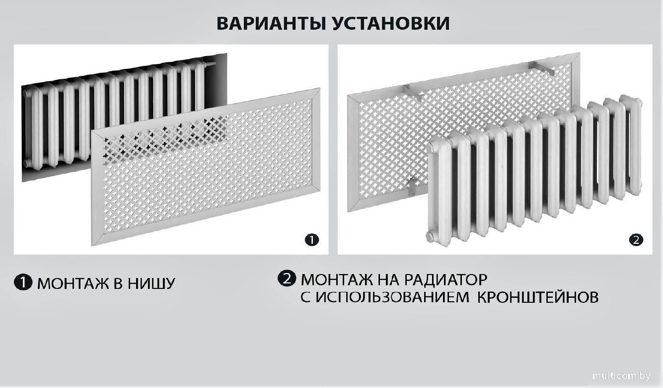 | Информация | - Декоративный экран идеально подходит для скрытия и украшения радиаторов отопления. - Изготовлен из экологически чистого МДФ, что делает его безопасным для вашего дома. - Специальная конструкция обеспечивает высокую теплоотдачу, что позволяет эффективно использовать радиатор. - Установка экрана должна производиться на высоте не менее 35—40 мм от радиатора и 60—70 мм от пола и подоконника для оптимальной работы. - Экран предназначен для монтажа с радиатором, установленным в нише, и может быть дополнен крышками, боковинами и кронштейнами для удобства. |