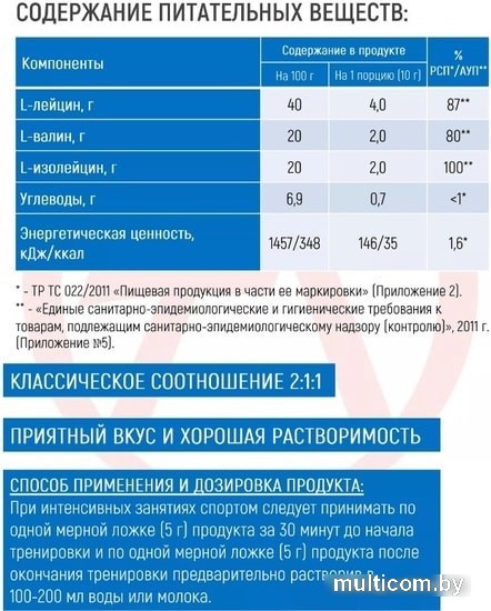 | Состав | Лейцин, валин, изолейцин, углеводы. |