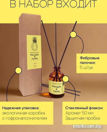 | Информация | ? В комплекте: стеклянный флакон с ароматом 50 мл и защитной пробкой, 5 фибровых палочек, упакованный в крафтовую коробку с гофронаполнителем. ? Площадь распространения аромата до 40 м?. ? 1 флакон хватает на 2 месяца ежедневного использования. ?? Содержит 30% парфюмерной композиции и 70% парфюмерной основы. |