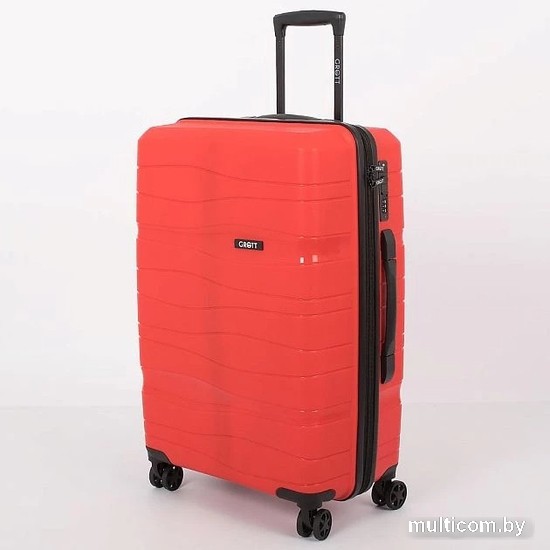 | Информация | Чемодан-спиннер из ударопрочного полипропилена с рельефной поверхностью в красном цвете. Модель на четырех сдвоенных колесах, с выдвижной ручкой с металлическими трубками, ручкой-переноской сверху. Закрывается молнией с двумя встречными бегунками с отверстиями для навесного кодового замка, не входящего в комплект. Имеется кодовый замок, утопленный в корпус. Внутри: фирменная подкладка плотностью 210 Ден. |