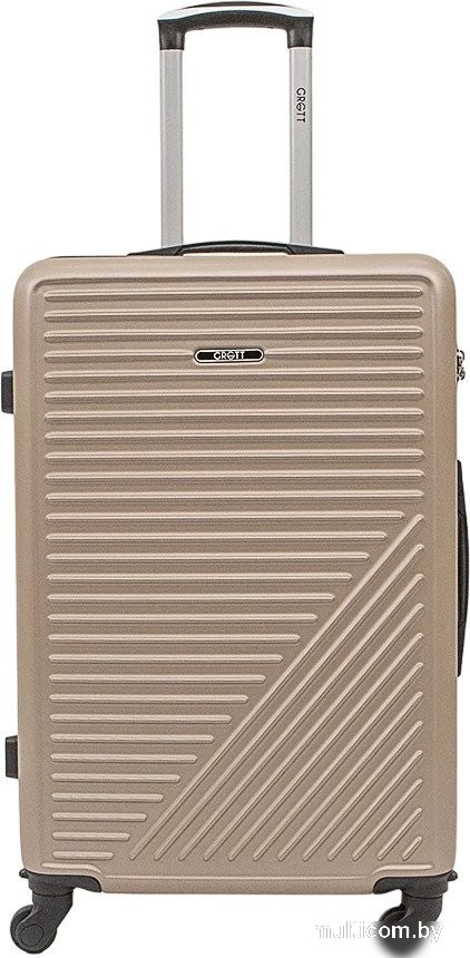 | Информация | Чемодан из ударопрочного материала с рельефной поверхностью. Модель на четырех съемных пластиковых колесах и пластиковыми ножками-опорами сбоку. Внутри: фирменная подкладка. |
