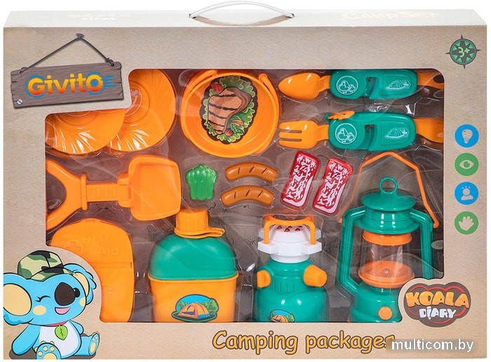 | Посуда, продукты, аксессуары в комплекте | лампа, примус, фляга, аптечка, сковорода, лопата, складной ножик, тарелка 2 шт., муляж продуктов 5 шт |