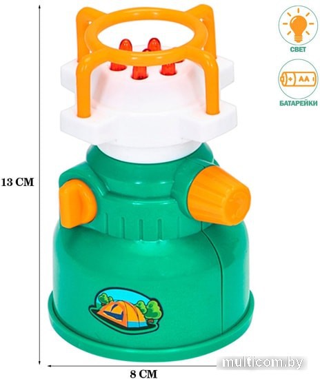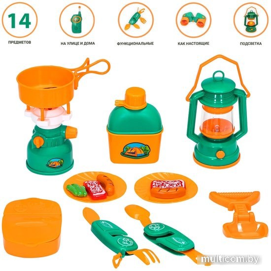 | Информация | Игровой набор Туриста идеальный выбор для игры в походы и пикники. Его можно использовать круглый год: летом для игр на природе, а в другое время для игр в детской комнате. Теперь у маленького путешественника будут свои собственные туристические предметы. Рекомендуется для мальчиков и девочек от 3 лет. Все самое нужное для пикника и туристического похода в одном наборе. Все предметы набора функциональные, максимально повторяют реальные предметы. Лампа и примус работают от 2-х батареек АА (в комплект не входят). Лампа, примус, фляга, аптечка, сковорода, лопата, складной ножик, тарелки в точности повторяют оригиналы. Игрушка изготовлена из прочного и безопасного пластика, устойчивого к механическому воздействию. Туристический набор выполнен в классических цветах, что понравиться юному туристу. Все предметы функциональные: в кружку фляжки можно налить воду, складной нож открывается и закрывается. Можно «готовить» еду поставив сковороду на примус. Игра с набором способствует развитию навыков в сюжетно-ролевой игре, стимулирует зрительно-моторную координацию, развивает логику. |