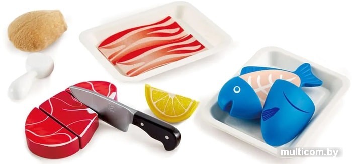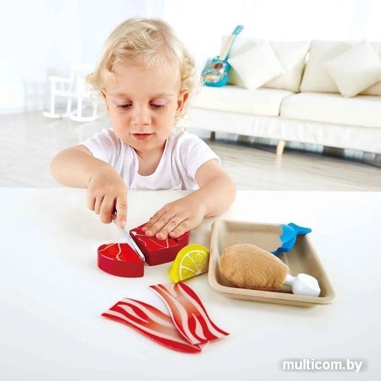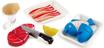 | Посуда, продукты, аксессуары в комплекте | нож (1 шт.), тарелка (2 шт.), курица, бекон, рыба, цитрусовые (лимон) |