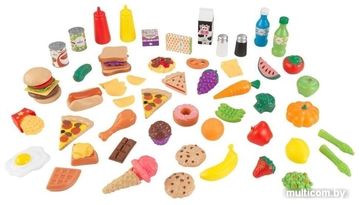 | Посуда, продукты, аксессуары в комплекте | солонка (2 шт.) Продукты: выпечка (печенье, вафли, пицца, пирог, рогалик), овощи (брокколи, помидор, морковь, горошек, тыква, сельдерей), фрукты (виноград, лимон, яблоко, арбуз, клубника, банан, апельсин), кетчуп (2 шт.), яйцо, молоко, шоколад, курица, картофель фри, напитки (2 шт.), бутерброд, мороженое, чипсы, масло, сыр |