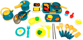 | Посуда, продукты, аксессуары в комплекте | 1 плита с грилем; 1 кастрюля с 1 крышкой; 1 сотейник с 1 крышкой; 1 чайник; 1 сковорода; 1 доска разделочная; 1 поднос; 2 тарелки плоские; 1 чашка; 1 миска; 1 ложка; 1 вилка; 2 палочки; 1 нож для пиццы; 2 лопатки; 1 половник; 1 шумовка; 1 ложка поварская; 1 нож для разделки мяса; 1 солонка и 1 кетчуп. |