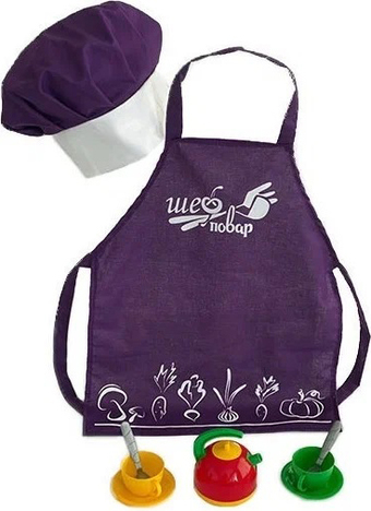 | Посуда, продукты, аксессуары в комплекте | чайник 1 шт. 2 чашки. 2 блюдца. 2 ложки. фартук. колпак. |