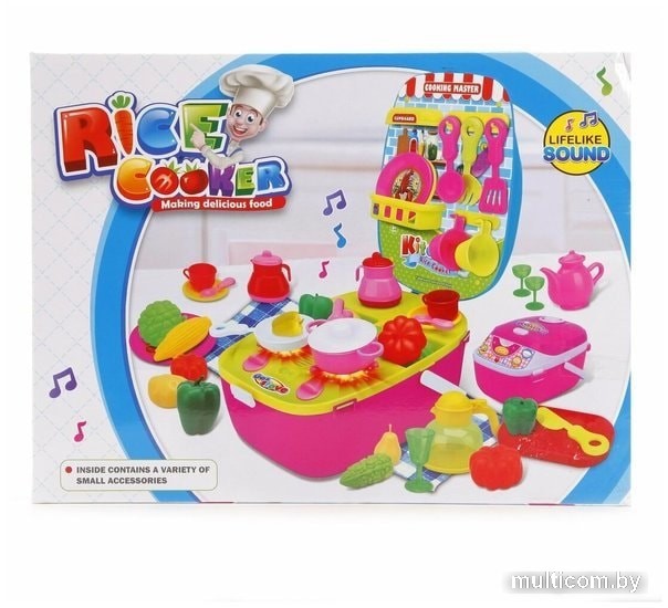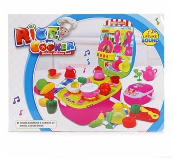 | Посуда, продукты, аксессуары в комплекте | чашка (3 шт), ложка, нож, кастрюля, сковорода, кухонные приборы (лопатка - 2 шт), тарелка (3 шт), чайник, кувшин, бокал (3 шт), заварник Продукты: овощи (картошка), перец |