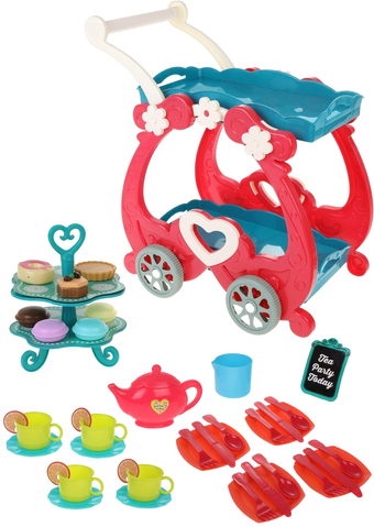 | Посуда, продукты, аксессуары в комплекте | 2 печенья, 1 пирожное, 4 пирожных «макарун», 1 пончик, 4 тарелки, 4 вилки, 4 ложки, 4 безопасных ножика, 1 многоярусное сервировочное блюдо для закусок, 4 блюдца, 4 чашки, 1 чайник с 1 крышкой, 4 картонные дольки лимона, 1 табличка меню и 1 молочник |