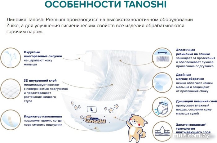 | Информация | ? Подгузники Tanoshi Premium Baby Diapers L 9-14 кг - это еще более мягкие и воздухопроницаемые подгузники, изготовленные из невероятно нежного и эластичного нетканого волокна с использованием последних технологий. ? Обработка материалов горячим паром. ? Двухслойная структура впитывающего слоя. ? Безклеевое крепление резиночек. ? 3D волнистый внутренний слой. ? Внешний слой с технологией выведения прелого воздуха. ? Двойные мягкие оборочки и эластичная резиночка на спинке. ? Округлые многоразовые липучки. ? Цветной индикатор наполнения. ? Одинаково хорошо подходят для мальчиков и для девочек. ? Детские одноразовые подгузники Premium для малышей еще мягче и нежнее, чем стандартная линейка. Комфортные и безопасные для кожи малыша, они превосходно впитывают по всей длине подгузника, не протекают, не оставляют следов на коже и не ограничивают движений малыша. ?? Линейка Premium производится на высокотехнологичном оборудовании Zuiko, а для улучшения гигиенических свойств все изделия обрабатываются горячим паром. |