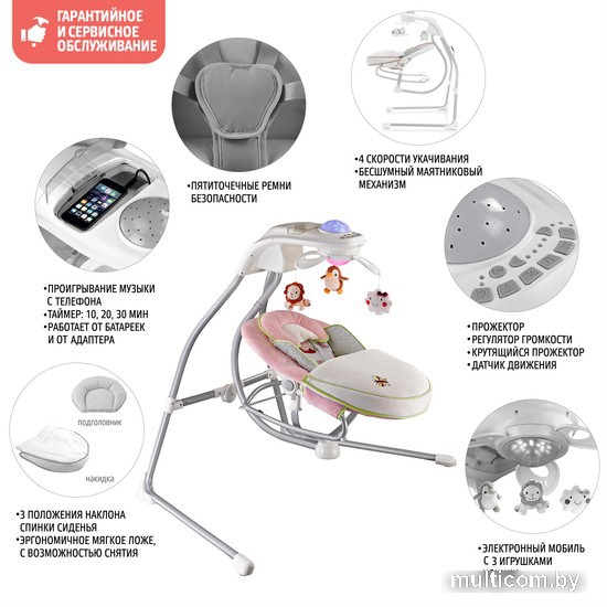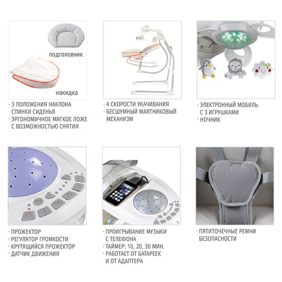 | Информация | Электрокачели «Casseta» («Домик») — уютное и невероятно удобное убежище для вашего малыша. Благодаря мягким вкладкам из нежного, приятного на ощупь материала и предусмотрительно включенной в комплект накидки на ножки, младенец будет чувствовать себя в креслице электрокачелей комфортно и безопасно. Электрокачели — прекрасный способ убаюкать новорожденного, развлечь его в периоды бодрствования и успокоить во время плача или капризов, и модель «Casseta» прекрасно справляется с этими функциями. Она обязательно полюбится и самому малышу, и маме, которая по достоинству оценит те минуты свободы, которые ей предоставит это удивительное и практичное устройство. Поворотная конструкция сидения, деликатное укачивание в нескольких режимах и очаровательный вращающийся мобиль — незаменимая развивающая игрушка для новорожденного — дополняют перечень преимуществ этой модели. Завершают образ изящные линии основания и нежные, пастельные расцветки. |