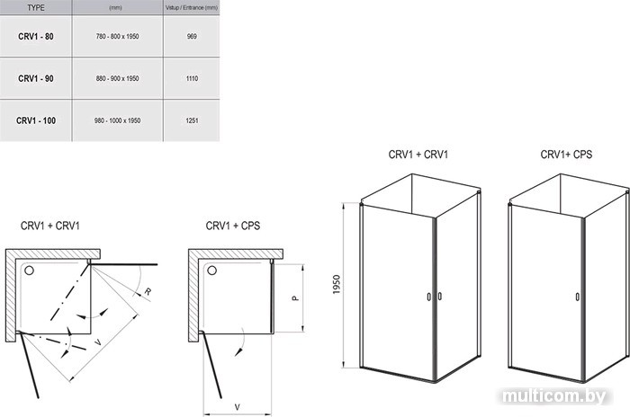| Информация | Одно изделие CRV1 образует половину душевого уголка. Для создания прямоугольного душевого уголка необходимо заказать 2xCRV1, либо душевую стенку CPS. Изделие устанавливается в облицованный кафелем угол ванной комнаты на поддоны RAVAK ANGELA, PERSEUS, PERSEUS PRO, PERSEUS PRO CHROME, GIGANT PRO, PERSEUS PRO FLAT, GIGANT PRO FLAT, GIGANT PRO CHROME или непосредственно на пол со встроенным душевым каналом или трапом. |