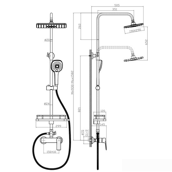 | Комплектация | верхний душ, штанга, ручной душ (лейка), держатель лейки, шланг, смеситель, полочки |