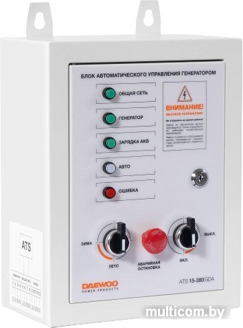 | Информация | Автоматический запуск электростанции в случае падения напряжения в основной сети или прекращения подачи электроэнергии. Контроллер постоянно отслеживает напряжение пускового аккумулятора электростанции и при необходимости заряжает его. Удобное крепление для монтажа на стену. Прочный металлический корпус, доступ к которому осуществляется с помощью ключа. Совместимость с моделями генераторов DAEWOO: GDA 7500E-3, GDA 7500DPE-3, GDA 8500E-3, GDA 12500E-3 |