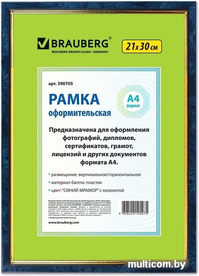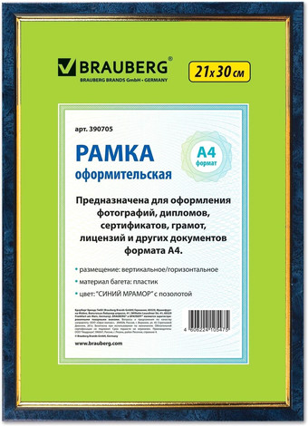 | Информация | Рамка BRAUBERG «HIT» для оформления фотографий, дипломов, сертификатов, грамот, лицензий и других документов формата А4 (21х30 см) будет гармонично смотреться в любом интерьере — дома и офисе, учебных учреждениях и магазинах, салонах и предприятий. Выполнена из пластика цвета «синий мрамор» с позолотой, за счет чего отлично впишется в домашний и деловой интерьер. Имеется возможность вертикального и горизонтального подвеса. Ширина багета — 15 мм. Аккуратный вид достигается благодаря стеклянной вставке. Микрогофрокартон обеспечивает плотное прилегание и отсутствие в будущем деформации содержимого в рамке. Термоусадочная пленка гарантирует сохранность рамки при транспортировке, отсутствие сколов и потертостей. |