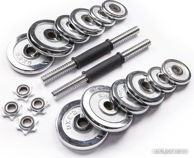 | Комплектация | - 2 грифа диаметром 26 мм, длиной 35 см (длина резьбы 11 см с каждой стороны) и весом 1,35 кг - 4 зажима, которые обеспечивают точные нагрузки давления - 4 диска х 0,5 кг (диаметр 9,5 см, ширина 1,4 см) - 4 диска х 1,25 кг (диаметр 11 см, ширина 1,8 см) - 4 диска х 2,5 кг (диаметр 15 см, ширина2,2 см) |