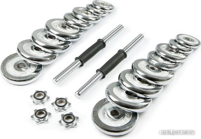 | Комплектация | - 2 грифа диаметром 26 мм, весом 1,35 кг - 4 зажима, которые обеспечивают точные нагрузки давления - 4 диска х 0,5 кг (диаметр 9,5 см, ширина 1,4 см) - 4 диска х 1,25 кг (диаметр 11 см, ширина 1,8 см) - 8 дисков х 2,5 кг (диаметр 11 см, ширина 1,8 см) |