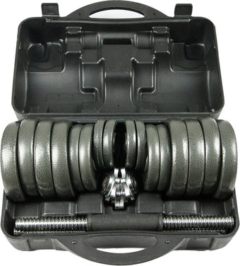 | Информация | ? Удобные разборные гантели в чемодане для домашних тренировок. ? Общий вес комплекта 30 кг. ? В комплекте 2 грифа со втулками и набор дисков. ? Возможность использовать диски с различными грифами и тренажерами. ? Достаточная прочность подтверждена краш-тестом. ? Представленные на изображениях гантели состоят из сплава стали (никель и сталь) и долговечные чугунные пластины. ? Они дополнительно оснащены рифлеными ручками, которые защищают от скольжения во время тренировки гантелей. |