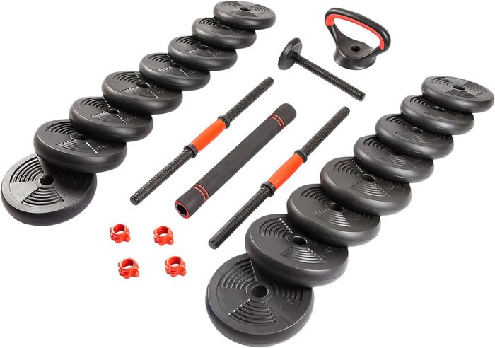 | Комплектация | - 2 грифа с пластиковой ручкой - 4 диска по 1.25 кг - 4 диска по 1.5 кг - 4 диска по 2 кг - 4 диска по 2.5 кг - 1 гриф для гирь - 1 соединительный гриф - 4 замка |