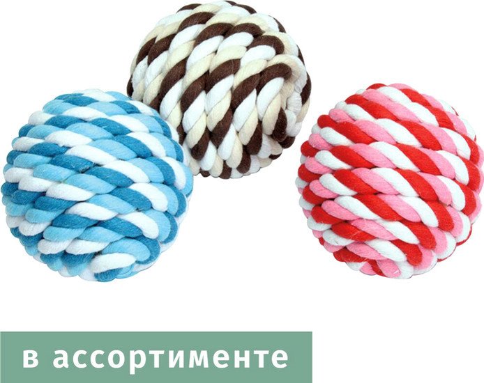 | Информация | Игрушка мячик плетеный для собак. Изготовлен из плетеных хлопковых веревок. Мяч удобно грызть и хватать зубами . Не травмирует зубы и десны, очищает от налета и камня. Подходит для самостоятельных игр и для тренировок по апортированию. |