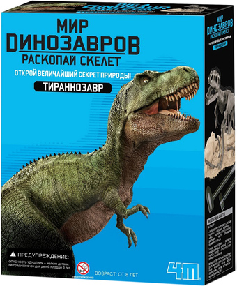 | Состав набора | - Гипсовый брикет (с костями динозавра внутри) - Молоточек со скребком - Зубило - Кисточка - Мягкий воск для соединения костей скелета - Поддон (из бумаги) - Инструкция на русском языке |