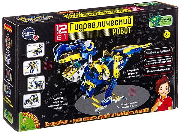 | Информация | Собери одну из 12 моделей гидравлических роботов на солнечной батарее. Узнай о научных принципах действия гидравлической системы и о способах ее применения. Простые инструкции с подробными иллюстрациями помогут успешно справиться с любой из 12 моделей, например с такими как слон, скорпион, экскаватор, багги-мобиль, робот с собакой и многих других! |