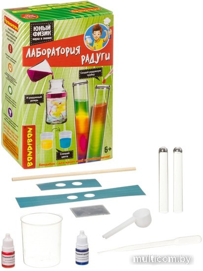 | Информация | Набор позволит сделать юным ученым первые веселые открытия посмотреть, как свет проходит через воду, образуя радугу, провести эксперименты по смешиванию жидкостей с разной плотностью, создать радужное колесо. |
