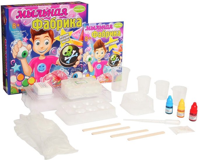 | Информация | Обычным мылом мы пользуемся ежедневно. А необычное, прикольное мыло, которое не найдешь в магазине, можно сделать только самостоятельно. Для этого не нужно открывать собственную мыльную фабрику она сама придет домой к юному творцу! Научно-познавательный набор Мыльная фабрика научит ребенка растапливать и остужать прозрачную мыльную основу, смешивать ее с красителями и придавать полученной смеси самые разные формы. В процессе создания необычных мыльных фигурок ребенок узнает об истории появления мыла и его составе, а также поймет, почему оно способно очищать различные поверхности от грязи. Это будут его первые знания в области естествознания и первые опыты в развитии творческой фантазии и художественных способностей. |