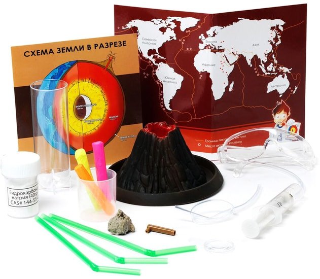 | Состав набора | В состав набора входят пластилин, карта вулканов, шприц, модель вулкана, порошок для создания лавы, трубочки, соединитель, схема Земли в разрезе, вулканическая порода, пробирка, увеличительное стекло, очки, вулкан, стакан, красочная инструкция. |