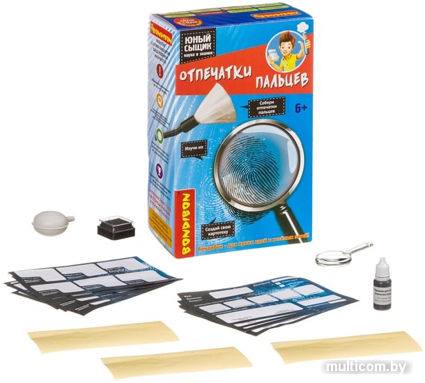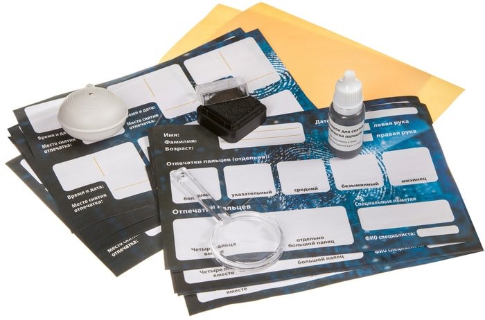 | Состав набора | штемпельная подушка, порошок для отпечатков пальцев, воздуходувка, увеличительное стекло, прозрачные наклейки 10 шт., карточки для отпечатков пальцев 10 шт., инструкция |