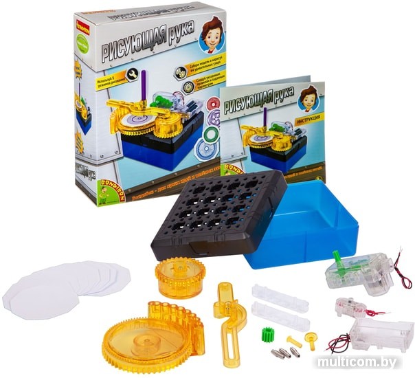 | Состав набора | В наборе батарейный отсек, переключатель, пружинное соединение, основание с отверстиями, экологичная коробка из вторичного сырья, коробка переключения передач, малая шестерня, платформа с шестернями и 8 отверстиями, вращательный элемент для рисующей "руки", рисующая "рука", большая втулка, малая втулка, бумажные десятигранники, соединительный мост, руководство пользователя. Дополнительно понадобятся 2 батарейки АА не входят в комплект. |
