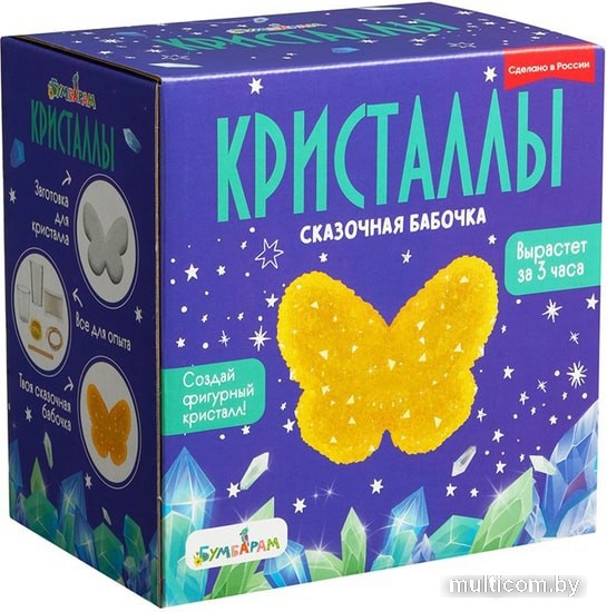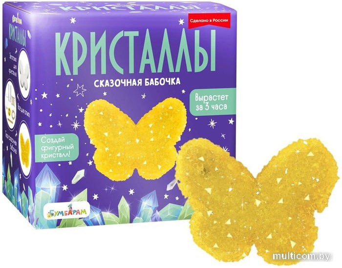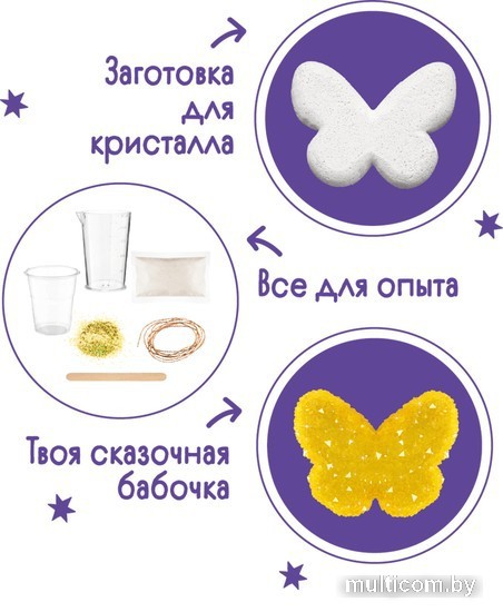 | Информация | Выращивание кристаллов – это отличная возможность не только понаблюдать за чудесами окружающего мира, но и сотворить их самому! С набором «Кристаллы:Сказочная бабочка» вы сможете изготовить сияющий фигурный кристалл в форме желтой бабочки. Кристальная фигурка станет как отличным украшением для комнаты, так и необычным подарком. В заготовке есть специальное отверстие, поэтому готовым кристаллом можно будет украсить комнату или повесить его на елку. Создать фигурный кристалл совсем несложно. В наборе есть все необходимое для безопасного опыта, а также подробная инструкция на русском языке. Для того чтобы создать сказочную бабочку, вам нужно приготовить раствор, следуя инструкции, затем опустить туда гипсовую заготовку и подождать. Уже через три часа у вас получится прочный фигурный кристалл, который будет радовать вас очень долго. Наслаждайтесь результатом! Откуда прилетела эта бабочка? Наверняка из волшебной страны! Сияющая желтая бабочка станет как отличным украшением для комнаты, так и необычным подарком. |
