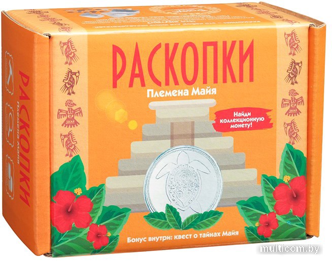 | Информация | Откройте для себя древнюю цивилизацию майя вместе с нашим набором раскопок! В красочной коробке помимо отличных инструментов — деревянного стека и молоточка — лежит познавательная мини-викторина. Отвечайте на вопросы и узнайте много интересных и реальных фактов из жизни древних цивилизаций! В окаменелом грунте спрятана настоящая монета, упакованная в индивидуальный футляр (совсем как у профессиональных коллекционеров!), а также россыпь красивых природных камней. Для того чтобы искать сокровища было проще, рекомендуем смочить брусок водой. |