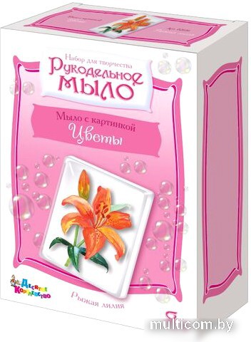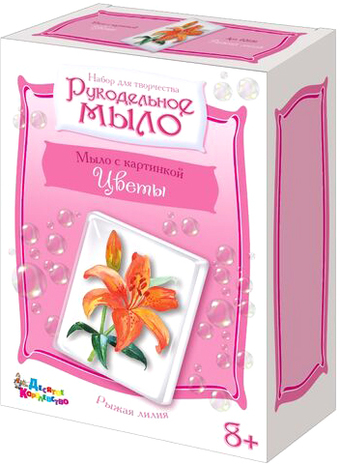 | Информация | Набор для изготовления мыла своими руками с картинкой «Рыжая лилия» входит в серию наборов «Рукодельное мыло». При помощи этого набора для творчества ребенок своими собственными руками создаст кусочек мыла с красивой картинкой лилии. Для этого потребуется внимание, ответственность и соблюдение инструкции, что вполне по силам детям от 8-ми лет и старше. Единственным ограничением является контроль и помощь со стороны взрослых при нагреве и манипуляциях с горячей мыльной основой. |