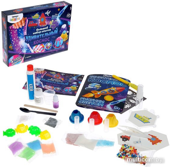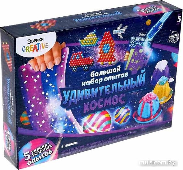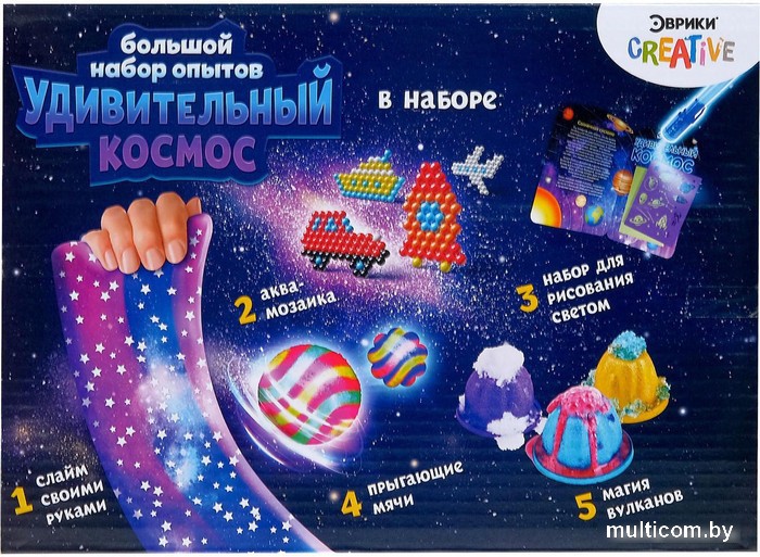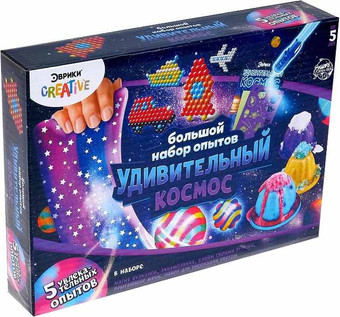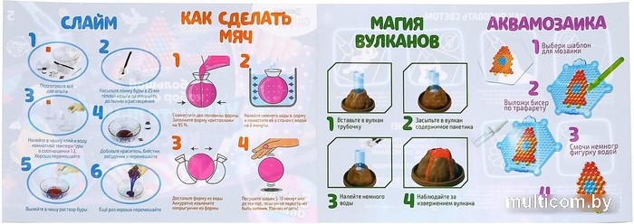 | Информация | ? Большой набор вмещает в себя 5 увлекательных опытов! ? Ребенок самостоятельно сможет: ? Создать слайм. ? Сделать объемную фигурку из аквамозаики. ? Порисовать светом. ? Провести эксперимент с вулканом. ? Вырастить милых зверушек-растушек с орбизами. ? Заниматься наукой совсем не сложно, а занимательно и весело, если делать это правильно! |
