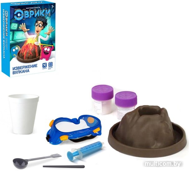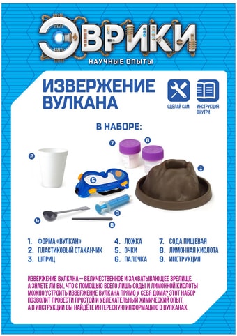 | Информация | Устройте дома настоящее извержение вулкана!Химия – одна из самых увлекательных наук, а провести простые, но эффектные химические реакции сможет даже начинающий учёный – убедитесь в этом с увлекательным опытом «Извержение вулкана» от «Эврики»!Набор не содержит никаких опасных химических веществ – для реакции понадобятся только лимонная кислота и пищевая сода (входят в набор). А провести опыт маленькому химику поможет познавательная инструкция с дополнительной информацией о самых больших вулканах мира.Опыт надолго увлечёт ребёнка и поможет привить ему любовь к науке и экспериментам. Изучайте химические реакции в форме весёлой игры! |