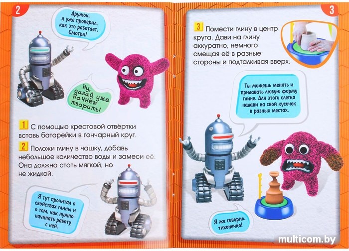 | Информация | Вращающийся гончарный круг, на котором благодаря умелым рукам мастера из обычной глины получаются невероятно красивые изделия, – это завораживающее зрелище! С помощью этого набора маленький исследователь сможет попробовать себя в этом непростом творческом деле и своими руками создать уникальные поделки из глины. Набор включает в себя всё необходимое, в том числе краски и кисточку, чтобы юный гончар смог раскрасить свои творения.Этот увлекательный и необычный опыт поспособствует развитию у малыша мелкой моторики, воображения, усидчивости и внимания, а также творческих способностей. |
