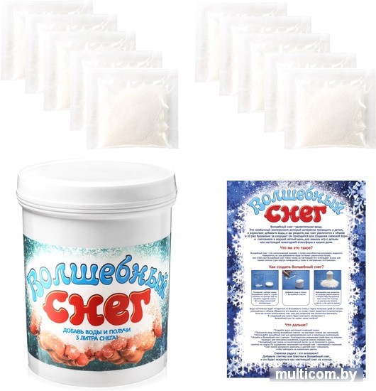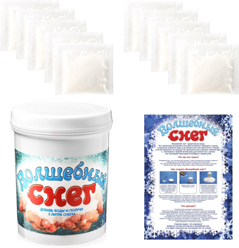 | Информация | Создайте дома снежную сказку, даже если за окном жаркое лето! Волшебный снег обладает удивительными свойствами: он не тает, очень похож на настоящий, долго хранится и занимает совсем мало места в сухом виде. Добавьте в него немного воды, и вы увидите настоящее шоу! Волшебный снег у вас на глазах превратится в целый сугроб белоснежного снега. Волшебный снег можно использовать многократно – после того, как он высохнет, просто смочите его водой, и он опять станет мягким и пушистым. Волшебный снег подходит для проведения экспериментов, развлечений, украшения интерьера к Новому Году. С помощью этого набора вы сможете получить до трех литров снега! В сухом виде его вес составляет всего 100 грамм. |
