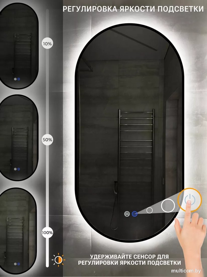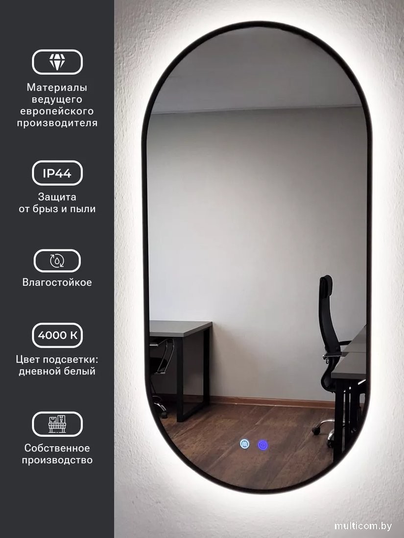 | Информация | - Большое овальное зеркало в стильной чёрной раме – идеальное решение для создания уникального интерьера. Его размеры позволяют увидеть отражение в полный рост, что делает его незаменимым элементом в любом помещении. - Подсветка дневного белого цвета (4000К) обеспечивает комфортное освещение, которое приятно для глаз. Сенсорное включение с плавным пуском срабатывает при лёгком касании, что добавляет удобства в использовании. - Это зеркало отлично впишется в прихожую, спальню, гостиную или детскую, наполняя пространство уютом и светом. Оно также станет стильным акцентом в коридоре. - Изготовлено из влагостойкого полотна со шлифованной кромкой, что делает его безопасным для использования в различных помещениях, включая душевые кабины, сауны и туалеты. - Навесное зеркало с функцией обогрева быстро устраняет запотевание, нагреваясь всего за 5-7 минут. - Матовая окантовка шириной 10 мм выполнена методом УФ-печати с использованием экологически чистых чернил, что гарантирует долговечность и устойчивость к влаге. Зеркало имеет класс электрозащиты 2 и защиту IP54, что делает его безопасным для использования в любых условиях. |