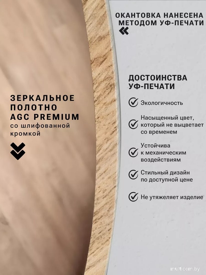 | Информация | - Матовая окантовка изготовлена с использованием УФ-печати, что обеспечивает высокое качество и долговечность. Мы применяем экологически чистые материалы, которые устойчивы к влаге, что делает изделие идеальным для различных условий. - Влагостойкое зеркальное полотно с шлифованной кромкой гарантирует четкое и яркое отражение, не искажая изображение. Это делает зеркало отличным выбором для ванной комнаты или прихожей. - Изделие комплектуется надежными креплениями, что упрощает процесс монтажа и обеспечивает стабильность. Вы можете быть уверены в его прочности и долговечности. - Не упустите возможность обновить интерьер с помощью этого стильного и функционального зеркала! |