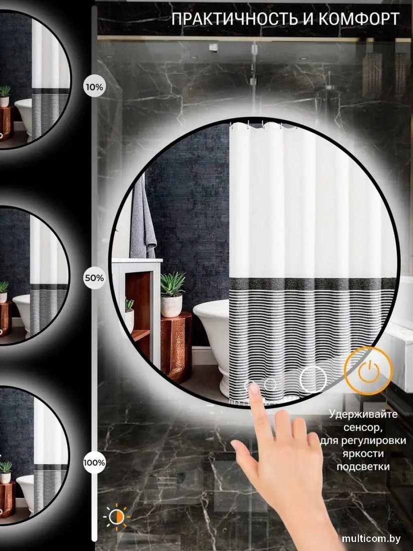| Информация | - Большое круглое зеркало в раме – идеальное решение для создания уникального стиля в вашем интерьере. Это зеркало станет настоящим акцентом в прихожей, спальне или гостиной. - Подсветка дневного белого цвета (4000К) обеспечивает комфортное освещение, которое приятно для глаз. Сенсорное включение с плавным пуском позволяет легко управлять освещением одним касанием. - Матовая окантовка шириной 10 мм выполнена с использованием экологически чистых чернил методом УФ-печати, что делает её устойчивой к влаге и безопасной для здоровья. Это зеркало можно смело устанавливать в помещениях с повышенной влажностью, таких как ванная комната, душевая кабина, баня или сауна. - Зеркало оснащено обогревом, который за 5-7 минут устраняет эффект запотевания, обеспечивая вам комфортное использование. Нагревательный элемент имеет 2 класс электрозащиты и защиту IP54, что гарантирует безопасность. - Поверхность окантовки обладает бархатистым и изящным блеском, добавляя элегантности в ваш интерьер. Это зеркало станет не только функциональным, но и стильным элементом вашего дома. |