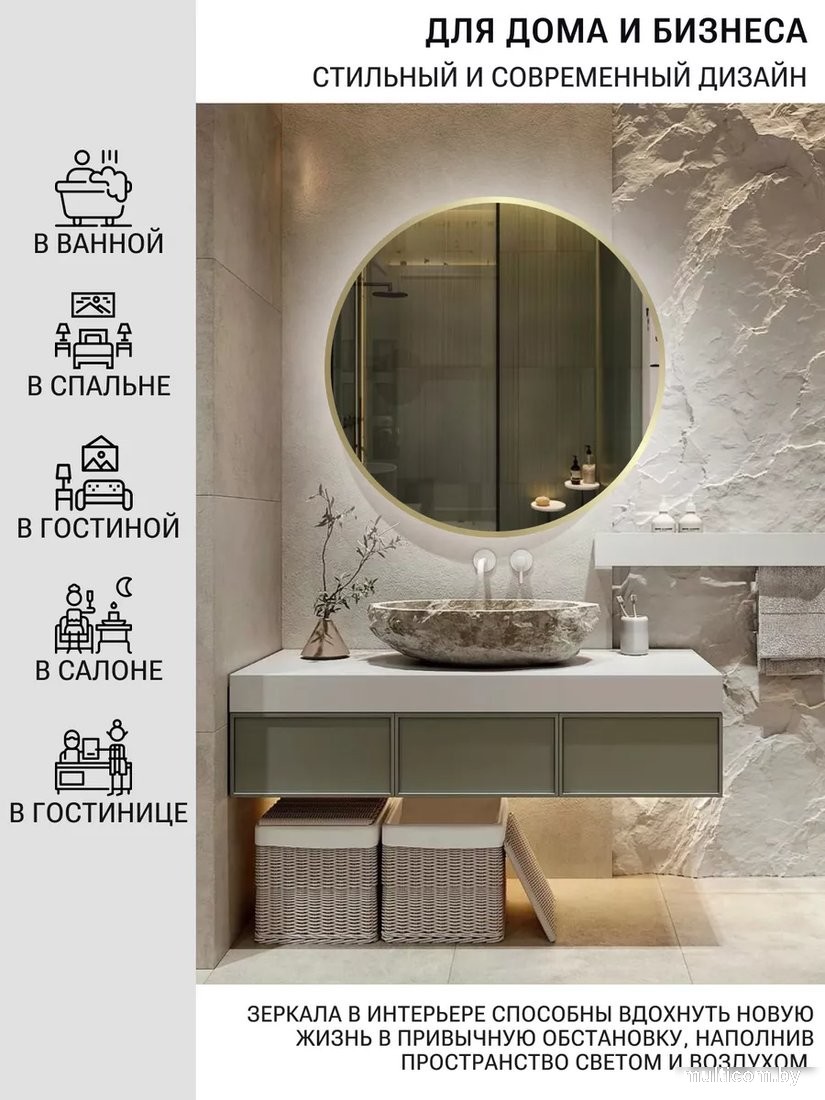 | Информация | - Круглое зеркало на стену с окантовкой – идеальный элемент для создания уникального стиля в вашем интерьере. Это зеркало станет настоящей находкой для прихожей, спальни, гостиной или детской, добавляя уют и свет в любое пространство. - Подсветка дневного белого цвета (4000К) обеспечивает комфортное освещение, которое приятно для глаз. Сенсорное включение на движение позволяет легко управлять освещением одним взмахом руки. - Изготовлено из влагостойкого полотна со шлифованной кромкой, это зеркало безопасно и удобно в использовании. Оно идеально подходит для установки в помещениях с повышенной влажностью, таких как ванная комната, душевая кабина, баня или сауна. - Матовая окантовка шириной 10 мм выполнена методом УФ-печати с использованием экологически чистых чернил, что делает ее устойчивой к влаге и безопасной для здоровья. - Зеркало укомплектовано прочными крепежами и готово к самостоятельному монтажу, что делает его установку простой и быстрой. Создайте стильный и функциональный интерьер с помощью этого декоративного светящегося зеркала! |