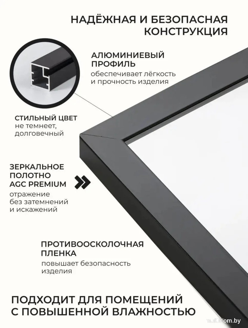 | Информация | - Настенное зеркало в полный рост - стильное и изысканное изделие. - Интерьерное прямоугольное зеркало в черной алюминиевой раме. - Размеры позволяют разместить зеркало во весь рост в примерочную, в гардеробную и в салон красоты. - Подвесное зеркало подходит для прихожей, спальни, гостиной и коридора. - Алюминиевая рама обеспечивает прочность и защиту от сколов и повреждений. - Алюминий не подвержен коррозии, плесени и другим негативным внешним факторам. - Зеркальное полотно AGC категории премиум не искажает отражение, проклеено противоосколочной пленкой для дополнительной защиты. - Изделие укомплектовано прочными креплениями и готово к монтажу. - Зеркало подходит для эксплуатации в помещениях с повышенной влажностью. - Лаконичный дизайн зеркала в алюминиевой раме идеально впишется в любой интерьер. |