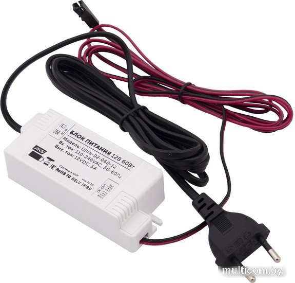 | Информация | Используется для понижения рабочего напряжения с 220 В переменного тока до 12 В постоянного для светодиодных лент и светодиодных светильников. Длина шнуров по 2 м |