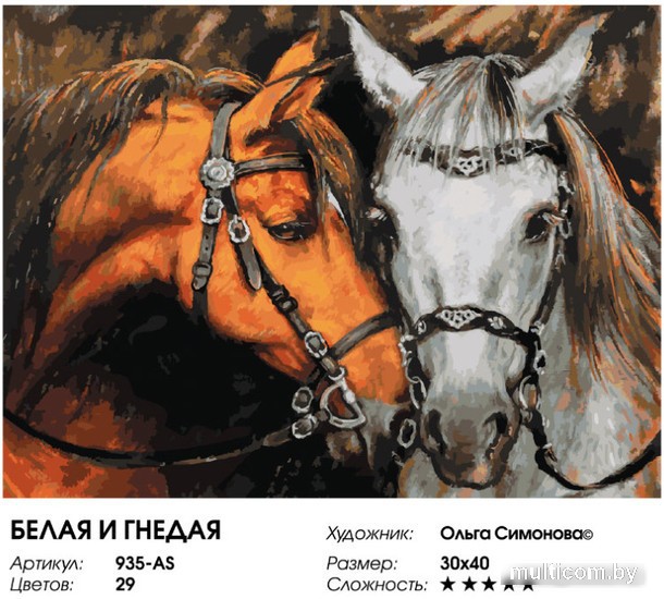 | Информация | ? Откройте в себе творческие способности вместе с товарами для хобби и творчества. ? Художник Ольга Симонова изобразила лошадей с любовью к четвероногим друзьям. ? Эта картина предназначена для людей, любящих животных, особенно лошадей. ? Испробуйте свои навыки в рисовании по номерам и воссоздайте авторскую картину. ? Для раскрашивания секторов используйте акриловые краски на водной основе и кисточки. ?? Кисти разного размера помогут плавно закрасить большие участки и прорисовать контуры объекта. |