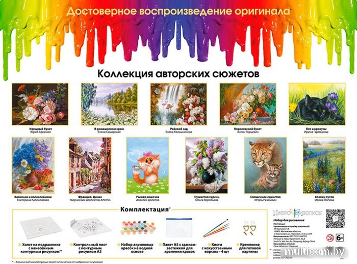 | Комплектация | контрольный лист, холст, краски, кисти (4 шт.), инструкция, крепление, пакет (с zip-застежкой) |