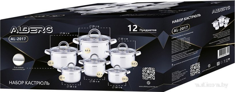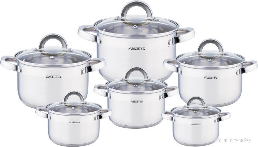 | Состав набора | Состав набора кастрюль: - 6 кастрюль: - 2.0 л (?16 х 10.5 см) - 3.0 л (?18 х 11.5 см) - 4.0 л (?20 х 12.5 см) - 5.0 л (?22 х 13.5 см) - 6.5 л (?24 х 14.5 см) - 8.0 л (?26 х 15.0 см) - 6 крышек из жаропрочного стекла с отверстием для выхода пара. |