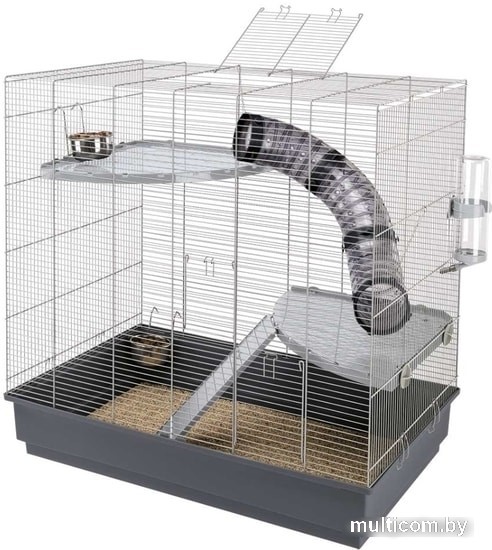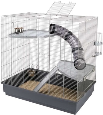 | Информация | Jenny - вертикальная клетка для крыс с необходимым для них пространством. Вашему питомцу понравится исследовать все уровни клетки, состоящие из пластиковых полок, соединенных туннелями. Клетка оборудована и другими аксессуарами, такими, как поилка, пластиковая лесенка и миски из стали, прочные, гигиеничные и оборудованные крючками. Поддон легко отсоединяется от металлической решетки, что очень удобно при уборке. Дополнительно можно приорести металлическую подставку на колесах. |